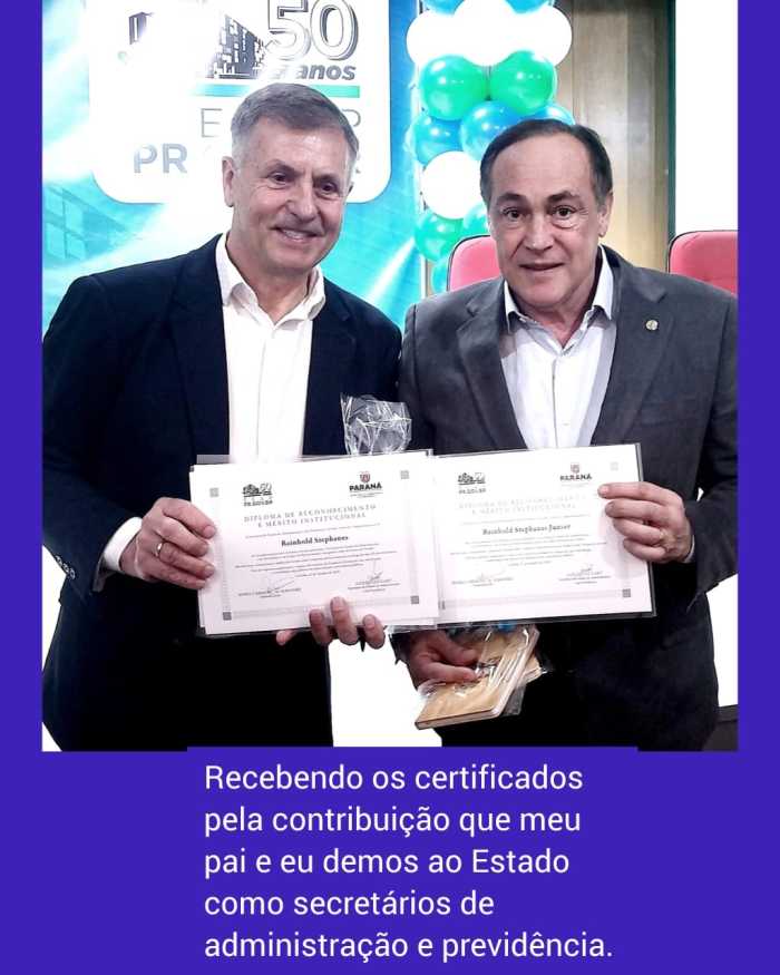 O deputado federal Reinhold Stephanes Júnior e seu pai, o ex-ministro Reinhold Stephanes, receberam esta semana, em Curitiba, diplomas de reconhecimento e mérito institucional do governo do Paraná pelos serviçospara consolidar as políticas da administração pública do estado. A homenagem fez parte doevento realizado no Palácio das Araucárias, sob o comando do secretário Luizão Goulart, para comemorar os 50 anos da Secretaria da Administração e Previdência do Estado do Paraná (SEAP).